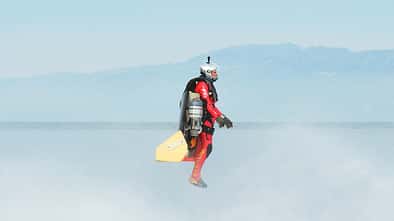 Yves Rossy, bekannt als Jetman, startet mit seinem aufgerüsteten Wingsuit jetzt auch vom Boden....