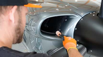 Bei der anschließenden Lackaufbereitung gilt der Grundsatz: so wenig Abtrag wie möglich, so viel wie nötig. Dafür setzt Björn verschiedenste Polierpads und Polituren ein. "Man mag es kaum glauben, aber Lammfell ist ziemlich abrasiv", erklärt er. Solch grobes "Werkzeug" sei nur bei wirklich verlebten Lacken angezeigt. Und wenn man es einsetzt, müssen es am Ende mindestens drei Poliergänge sein, damit die Abstufungen zwischen den Körnungen nicht zu groß werden. "In den allermeisten Fällen reichen zwei Gänge und am Ende auf Wunsch noch eine luftfahrttaugliche Keramikversiegelung", erklärt Björn. Wie hart er den Lack rannehmen muss, prüft er an einer unauffälligen Stelle. Generell bedarf es guter Zugänglichkeit – "bei großen Flugzeugen helfen Leiter oder Hubsteiger" –, einer ordentlichen Beleuchtung und des richtigen Equipments.