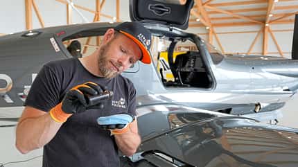 Mitunter muss Björn seinen Kunden auch sagen, was nicht geht. "Cirrus beispielsweise erlaubt keine Keramikversiegelung für seine Flugzeuge. Und auch Benzinrückstände, die über Jahre aus Drainventilen auf Radschuhe getropft sind und einwirken konnten, kann ich nicht entfernen, weil das in den Lack einzieht. Da muss ich sagen: Sorry, das wird nichts."