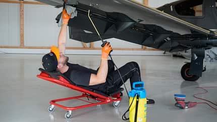 Probiers mal mit Bequemlichkeit! Die Roll-Liege erleichtert Arbeiten an der Unterseite des Flugzeugs.