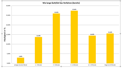 Erwartbar waren die Ergebnisse auf die Frage nach der Verfahrensdauer: Nur in knapp drei Prozent der Fälle dauerte es weniger als einen Monat, bis das LBA entschieden hatte. In knapp 14 Prozent waren es bis zu drei Monate, rund ein Viertel der Verfahren zog sich bis zu sechs Monate hin. Mit 27,5 Prozent dauerten die meisten Verfahren sechs bis zwölf Monate, und jeweils rund 15 Prozent der Verfahren liefen 12 bis 24 Monate oder länger als 24 Monate.