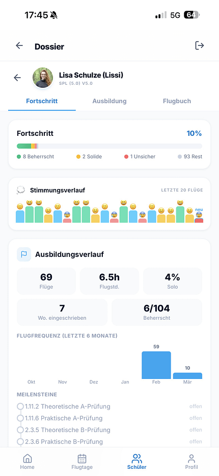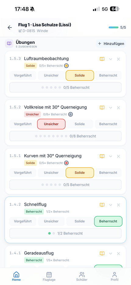 Das klingt erstmal simpel, schafft aber etwas, was im Ausbildungsalltag oft fehlt: ein gemeinsames Verständnis davon, wo ein Schüler wirklich steht. Interessant wird es bei der Frage, wann eine Übung wirklich als abgeschlossen gilt. Denn natürlich ist nicht jede gleich: Eine Ruderfunktion ist im Zweifel einmal gezeigt und verstanden. Eine saubere Landung hingegen darf gern öfter gelingen, bevor man den Haken setzt. Genau das ist im System bereits hinterlegt und lässt sich entsprechend gewichten. Damit entsteht eine Verbindlichkeit, egal wer gerade hinten drin sitzt.