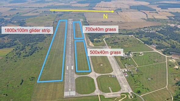 Auf dem Flugplatz selbst geht es mehr als großzügig zu. Die Betonbahn (08/26) ist 2000 Meter lang und 52 Meter breit, daneben erstreckt sich über 1800 mal 100 Meter die Grasbahn für den Segelflug. Eine kleinere von 700 mal 40 Meter ergänzt sie. Außerdem gibt es großräumige Parkflächen für die Flugzeuge.