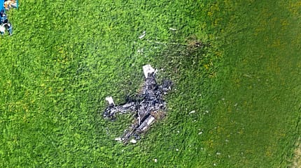 Die Unfallstelle mit der kaum noch zu erkennenden Skylane bietet ein Bild des Grauens. Nach den Löscharbeiten der Feuerwehr entschärfen Beamte des Landeskriminalamtes, die zur Unfallstelle gerufen worden waren, den Raketenantrieb des Gesamtrettungssystems. Der Fallschirm steckt ungenutzt im Pack-Container.